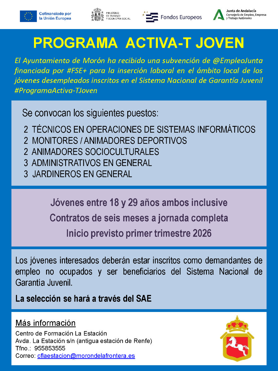 El Ayuntamiento de Morón de la Frontera ha recibido una subvención de la Consejería de Empleo, Empresa y Trabajo Autónomo de la Junta de Andalucía, financiada por la Unión Europea a través del Programa FSE+ Andalucía 2021-2027, para el desarrollo del programa Activa-T Joven, una iniciativa destinada a fomentar la inserción laboral y mejorar la empleabilidad de personas jóvenes desempleadas en el ámbito local